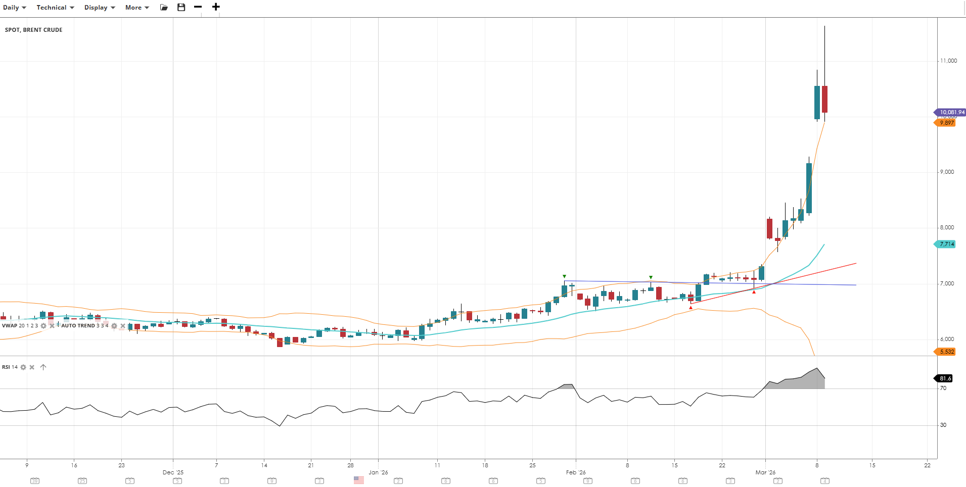Brent Crude has surged in a powerful impulsive bullish breakout, trading well above its VWAP with RSI in extreme overbought territory. The weekly chart confirms the move is a significant structural breakout, though the degree of extension from the mean suggests elevated risk of a sharp mean-reversion pullback in the near term.