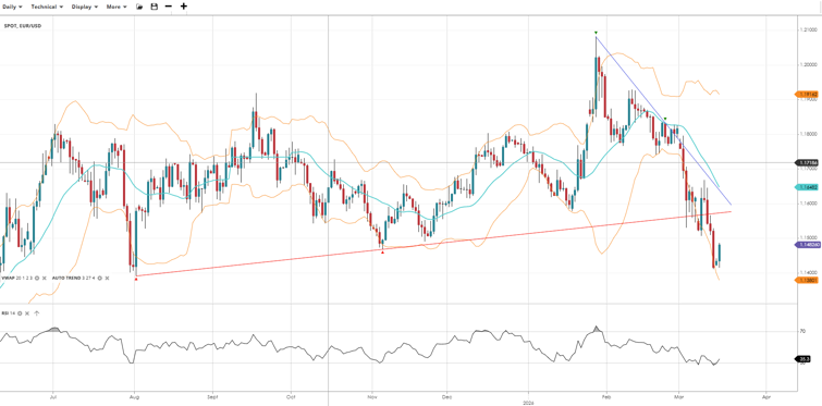 GBP/USD remains in a bearish near term trend within its broader sideways range, trading below the VWAP as it consolidates its recent losses. RSI has recovered from oversold levels into the low 40s, suggesting some stabilisation, though the pair remains vulnerable to further weakness while it holds beneath the VWAP.